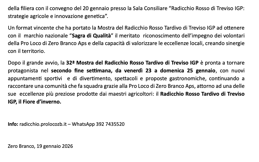 Comunicato Stampa: Successo di pubblico e contenuti alla 32^ Mostra del Radicchio Rosso Tardivo di Treviso IGP a Zero Branco