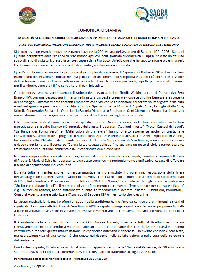 29^ Mostra Asparago di Badoere IGP - Sagra di Qualità a Zero Branco (TV) vi aspetta nei giorni 10-11-12 aprile e 17-18-19 aprile 2026